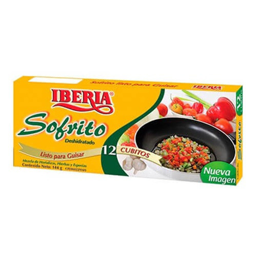 Cubitos para preparar sofrito elaborados con sal, grasa vegetal, resaltador de sabor, fécula, proteína vegetal hidrolizada, hortalizas, edulcorantes, hierbas y especias.